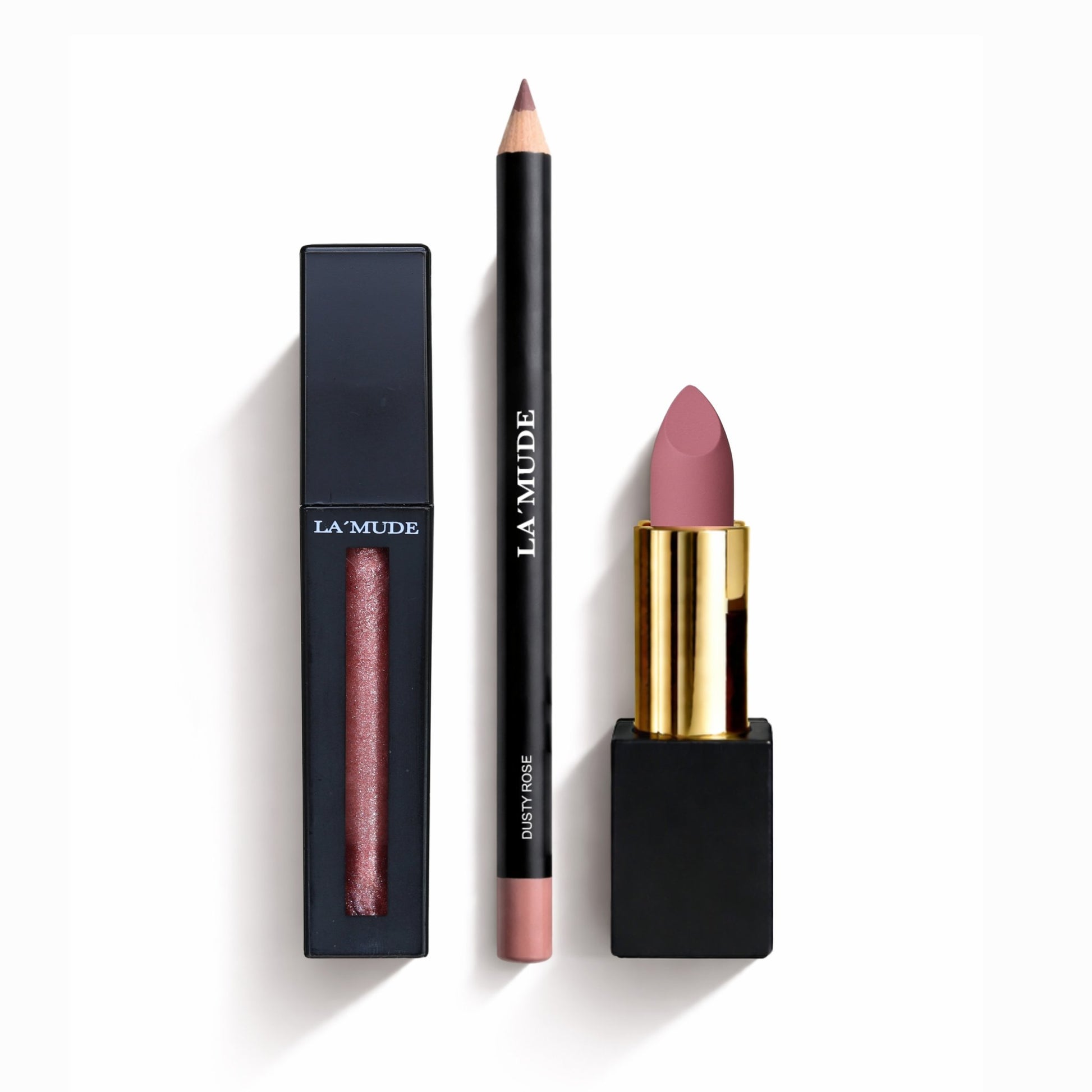 The soft glam combo you need. A brown lip liner paired with a creamy nude-pink lipstick and our signature pink gloss. Feminine, flattering, and always in style.